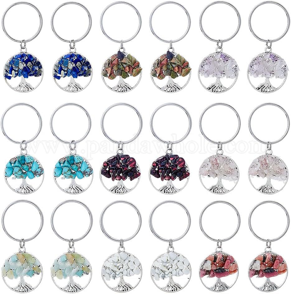 2 наборы брелок из смешанных натуральных и синтетических камней, с разрезными кольцами из нержавеющей стали и подвеской из сплава, плоские круглые с дерева жизни