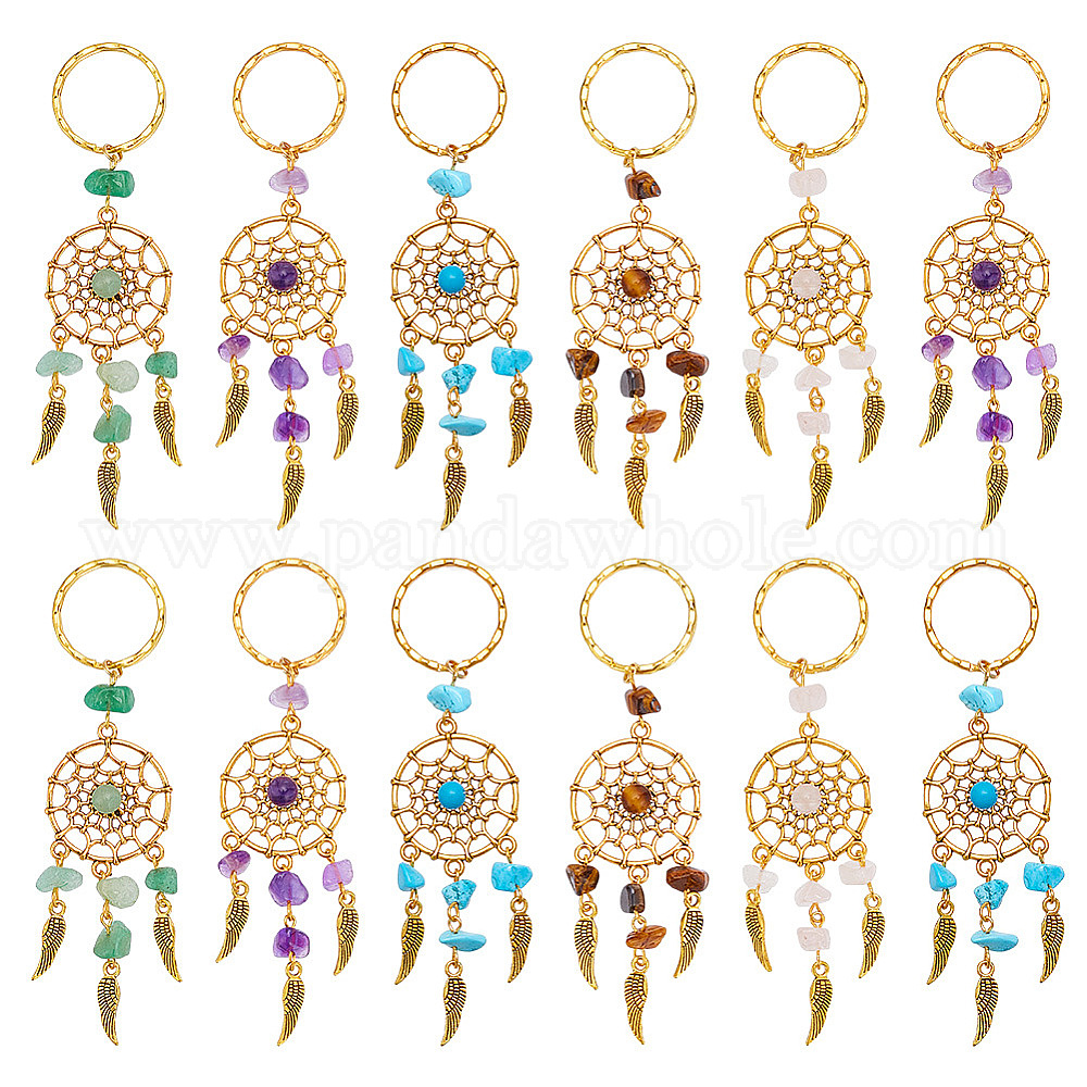 • Смешанные камни 12шт. плетеная сетка/паутина с перьями, подвеска из натуральных и синтетических драгоценных камней, с фурнитурой сплавочной тибетского стиля, 10.5 см