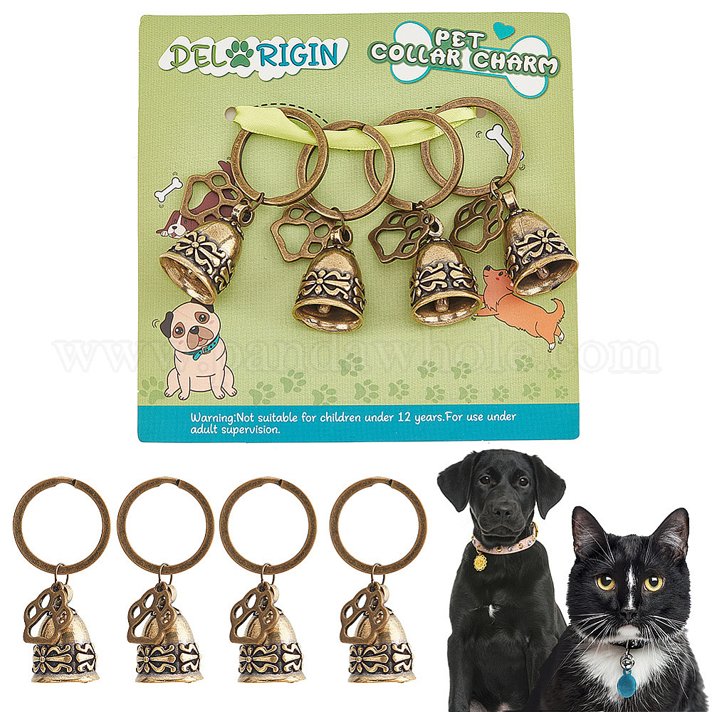 4 брелок с подвеской в виде колокольчика из винтажного сплава, с подвесками в виде лап, для украшения подвески для домашних животных
