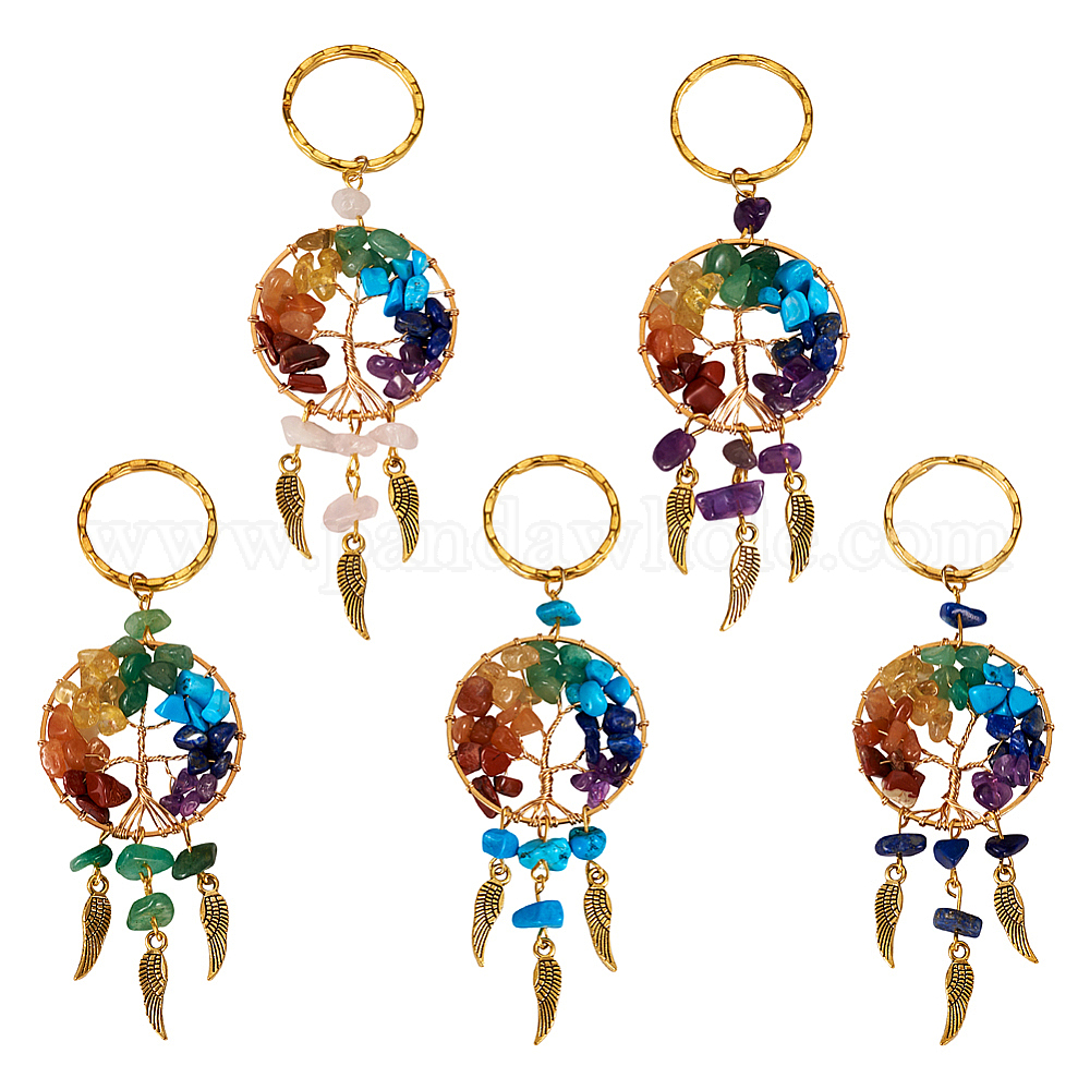 • Смешанные камни 5шт 5 стиль брелок с драгоценными камнями, с железными разрезными брелоками, подвески в виде крыльев из сплава и связующие кольца с деревом жизни из смешанных драгоценных камней, 11.2 см, 1 шт / стиль