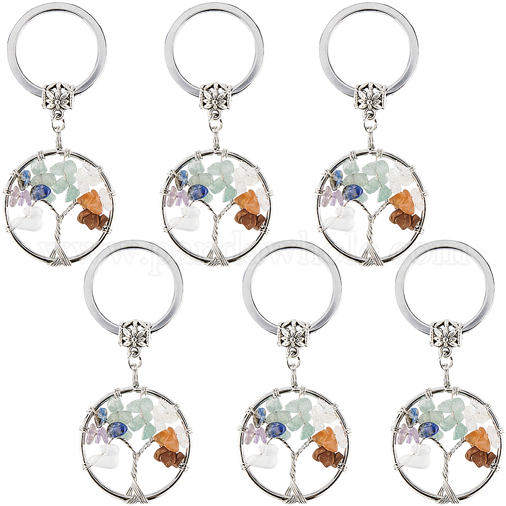 6шт. брелок из натуральных/синтетических смешанных драгоценных камней, с железными брелками и латунью, плоские круглые с дерева жизни