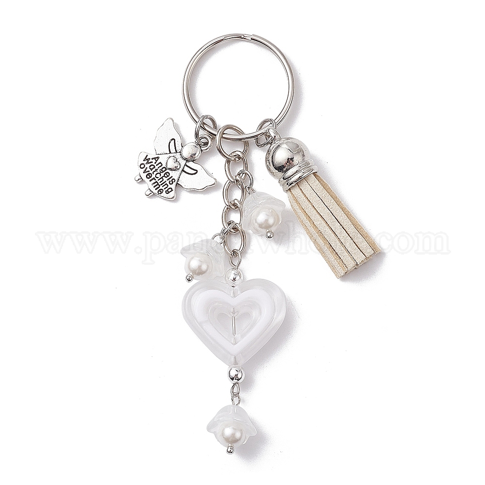 Акриловый брелок в форме сердца, с кисточками из искусственной замши и подвесками из сплава ангелов, а также железными брелоками для ключей