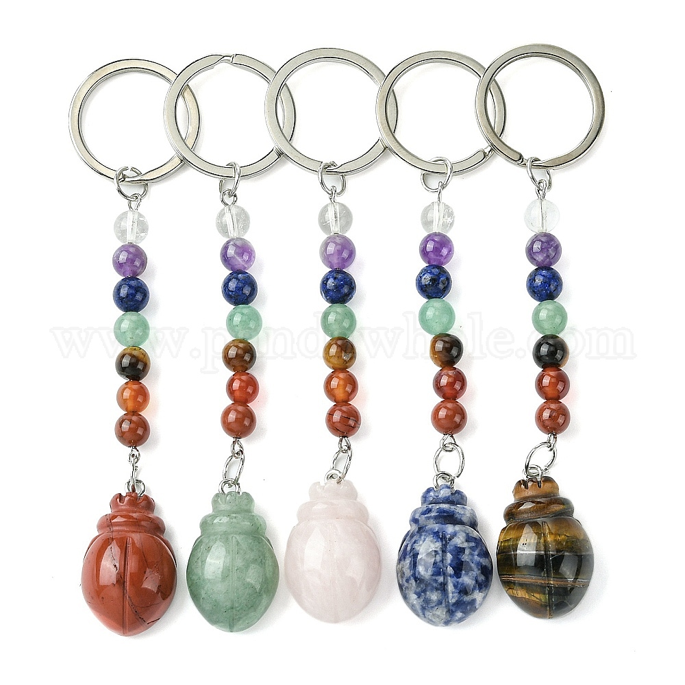• Смешанные камни Брелок с изображением жука из натурального драгоценного камня, с 7 бусинами из чакры и железными брелоками, подвеска для автомобильной сумки для женщин и мужчин, 10.9~11 см