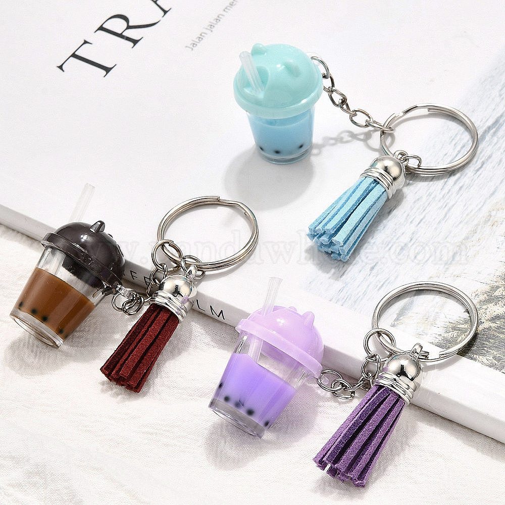 Брелок из искусственной замши с кисточкой и имитацией чая «бабл-ти» из смолы, с железными разрезными брелоками