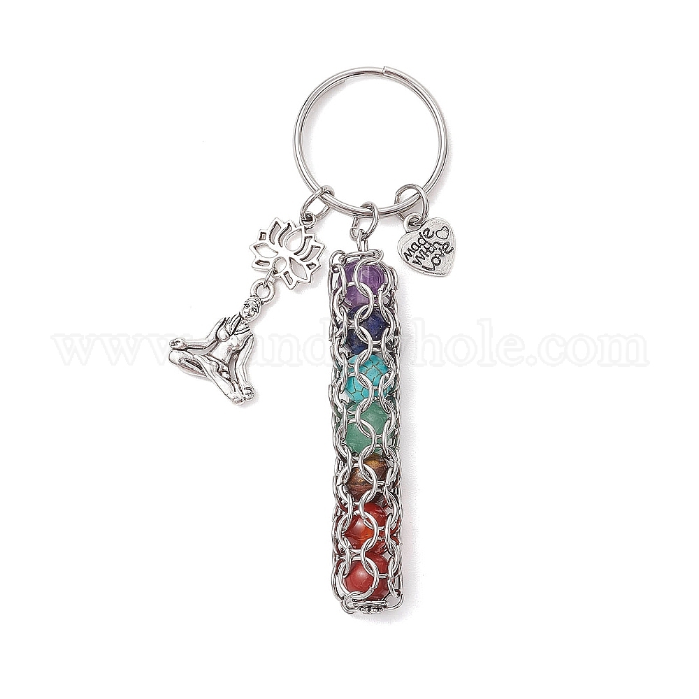 • Античный Серебристый & Платиновый Брелки для йоги с натуральным аметистом, сердоликом, красной яшмой, зеленым авантюрином, тигровым глазом и синтетической бирюзой, с 304 кольцами для ключей из нержавеющей стали, старинное серебро и платина, 91 мм, Кольцо: 25x3 mm, Пуля: 61.5x10 мм, Цветок: 13x12x1.5 мм, человек: 20x16x3 мм, pendat: 11.5x10x1.5 мм