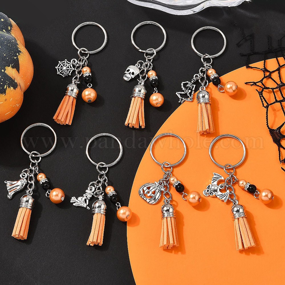 Брелки из сплава стекла и жемчуга, с подвеской-кисточкой из искусственной замши и железными кольцами для ключей, Хэллоуин тема, старинное серебро и платина