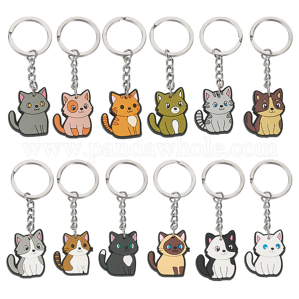 12 шт. 12 цвета подвесные брелки из ПВХ в форме кошки, с кольцом для ключей из сплава, платина