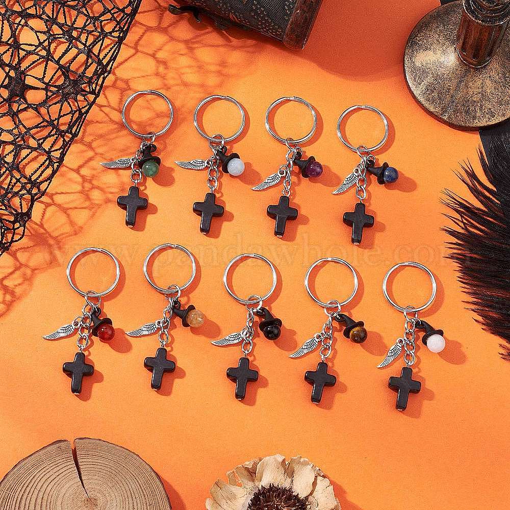 Брелки из натуральных смешанных драгоценных камней, с крестом из синтетической бирюзы и фурнитурой из сплава и железными разъемными кольцами для ключей