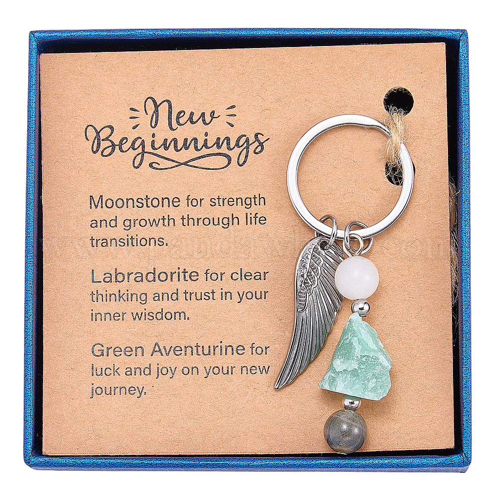 304 Брелки из нержавеющей стали с перьями из натуральных драгоценных камней, с 304 кольцами из нержавеющей стали, мешочком из органзы, бумажной карточкой и коробкой, платина (036N37)