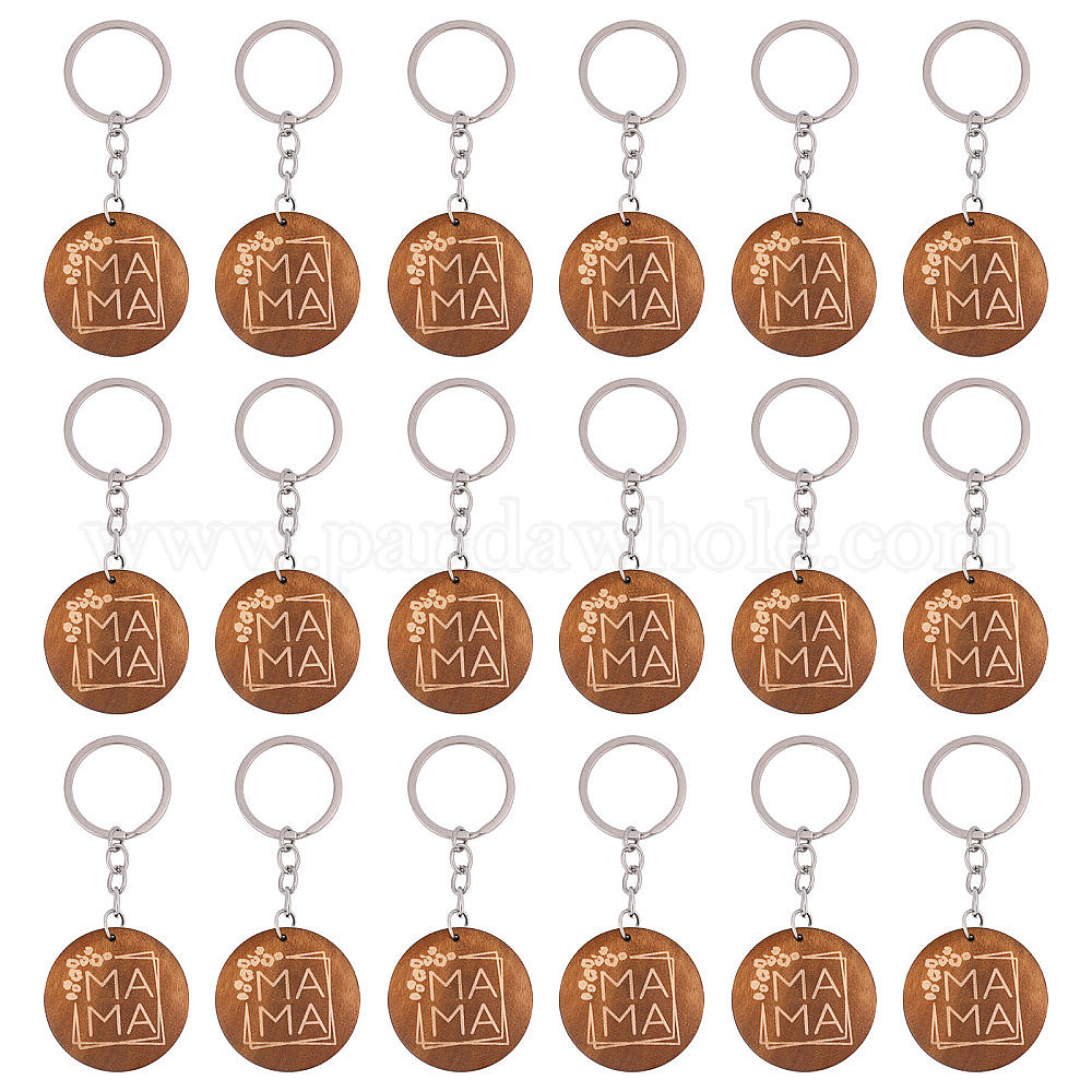 • Кокосово-Коричневый 50шт. гравированные деревянные плоские круглые подвески-брелоки, слово мама подарок на день матери брелок, с железной фурнитурой, кокосового коричневый, 97 мм