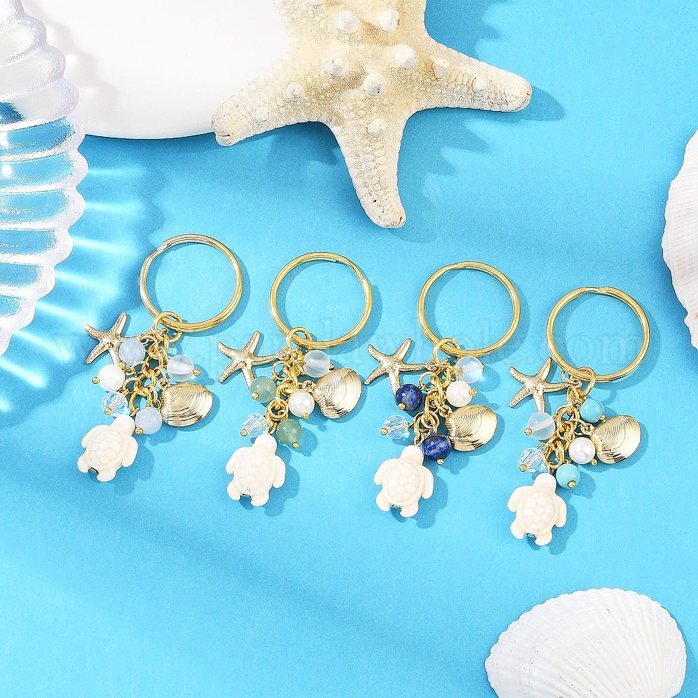 4 шт. 4 цвета серии Ocean: натуральный белый нефрит, лазурит, зеленый авантюрин, синтетическая бирюза, 304 брелок из нержавеющей стали в форме морской звезды и черепахи, с железными кольцами, золотые