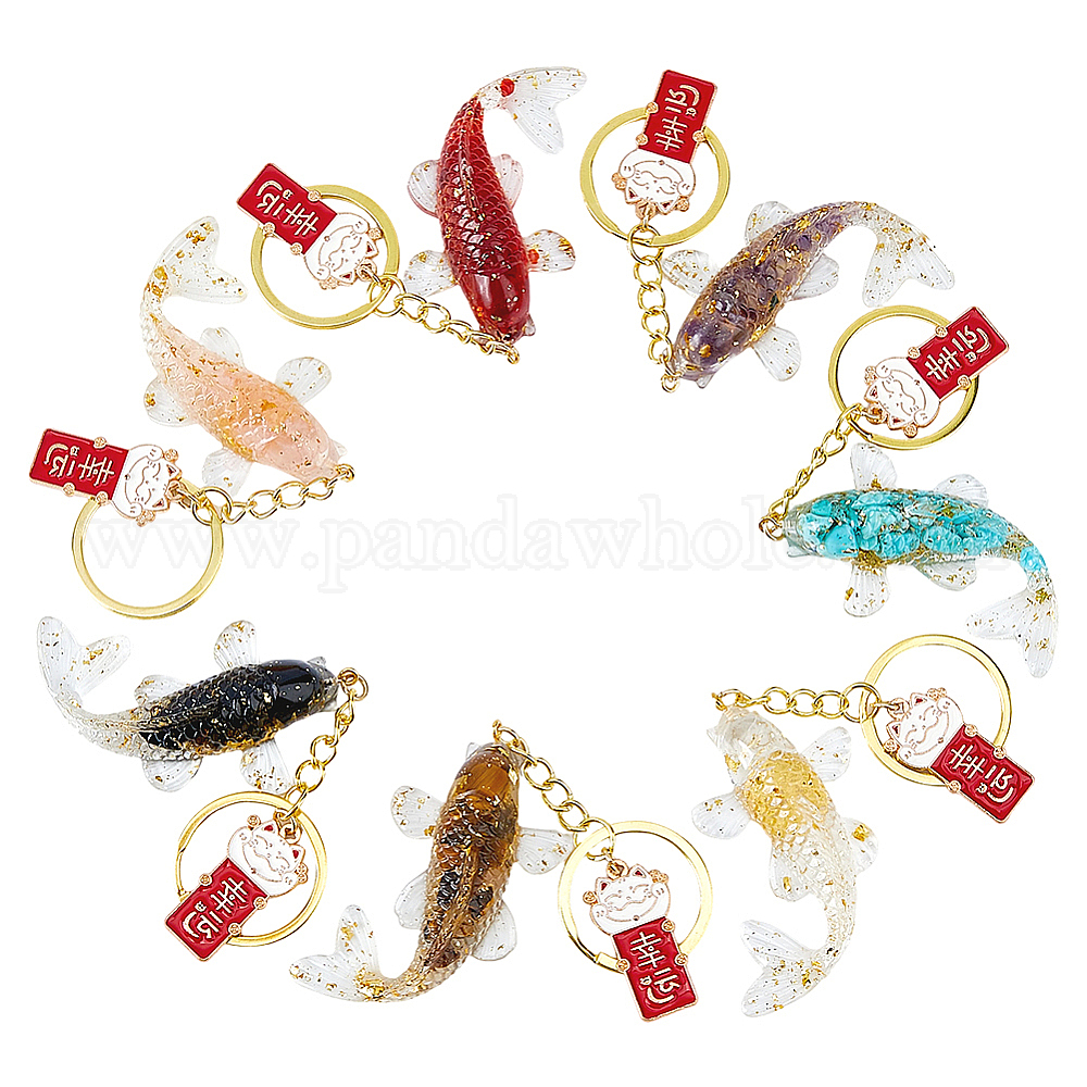 7брелок из смолы с натуральными и синтетическими драгоценными камнями и лампворком внутри, талисман в виде рыбы с золотой фольгой, с железными кольцами