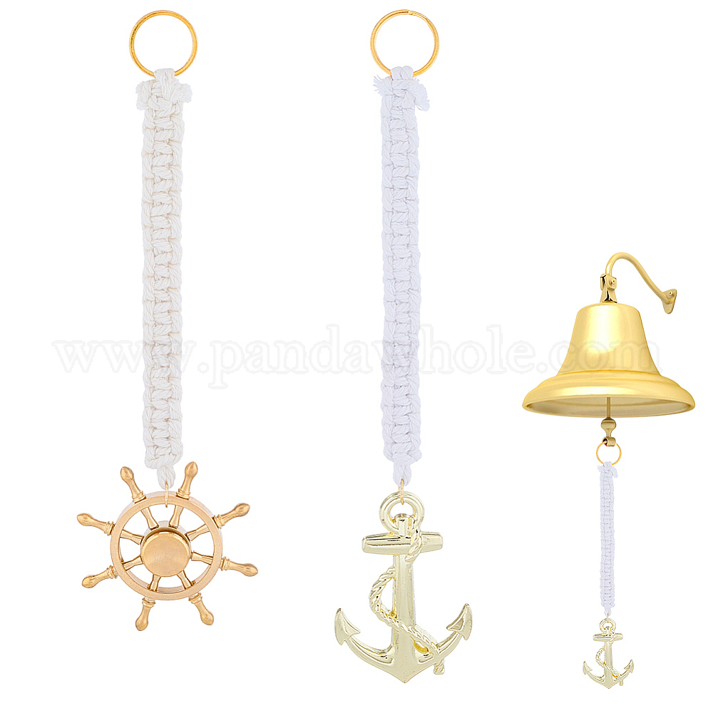 2 шт. 2 стили брелки из плетеной хлопковой веревки с подвеской в виде якоря и штурвала из сплава и латуни, с железными кольцами