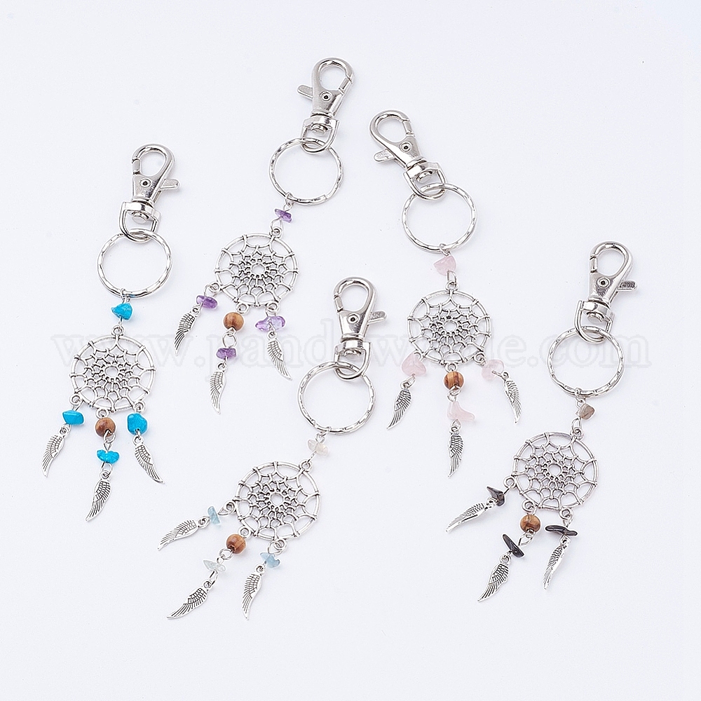 Сплетенная сеть / сеть с цепочкой для ключей из сплава пера, С бусами из драгоценных камней и латуни, старинное серебро и платина