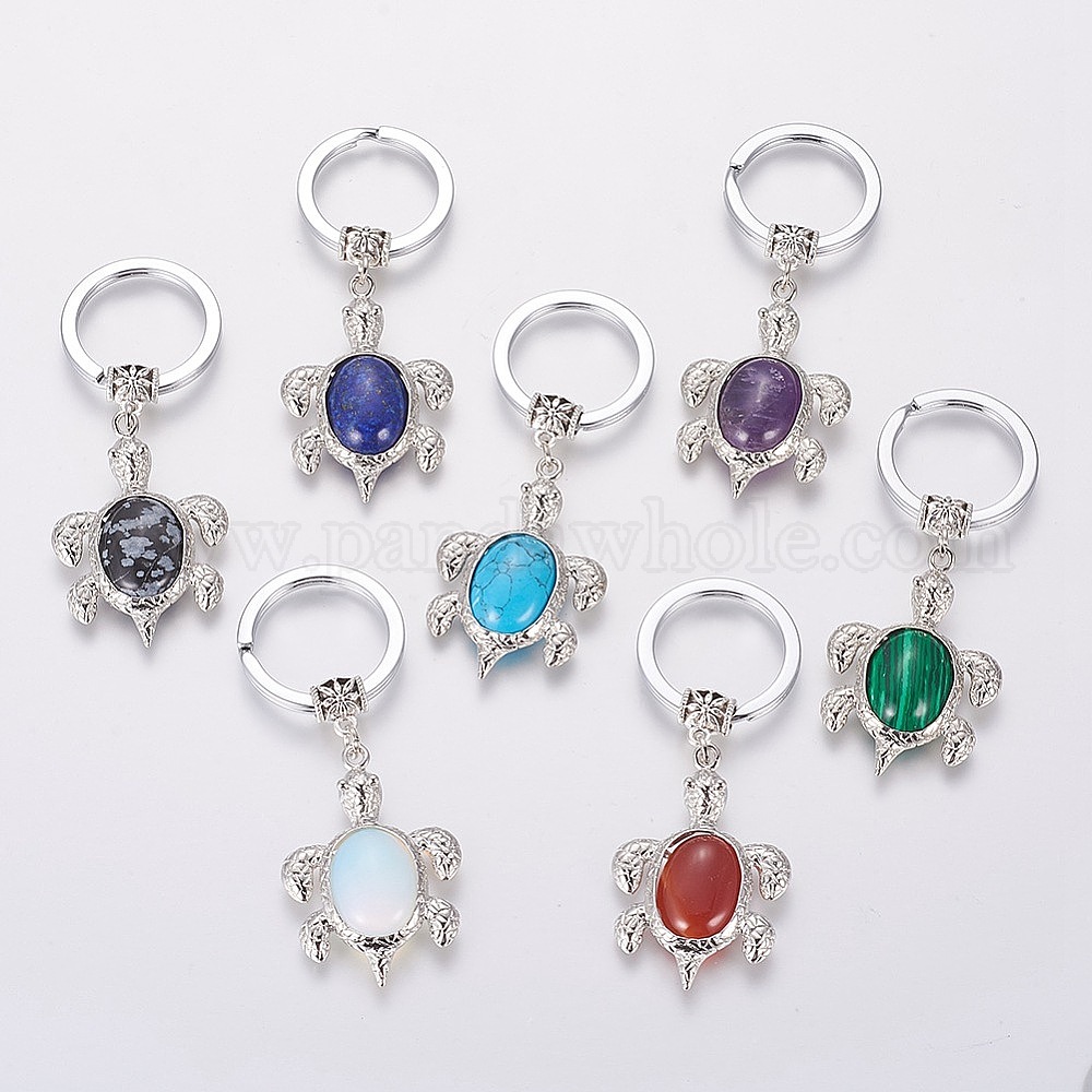 Брелок с драгоценными камнями, с железными разъемными кольцами для ключей и латунной находкой, Морская черепаха (00YGJD)
