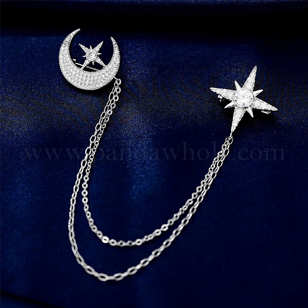Булавка на лацкан с луной и звездой из кубического циркония с подвесными цепями безопасности, латунный значок для воротника рубашки костюма
