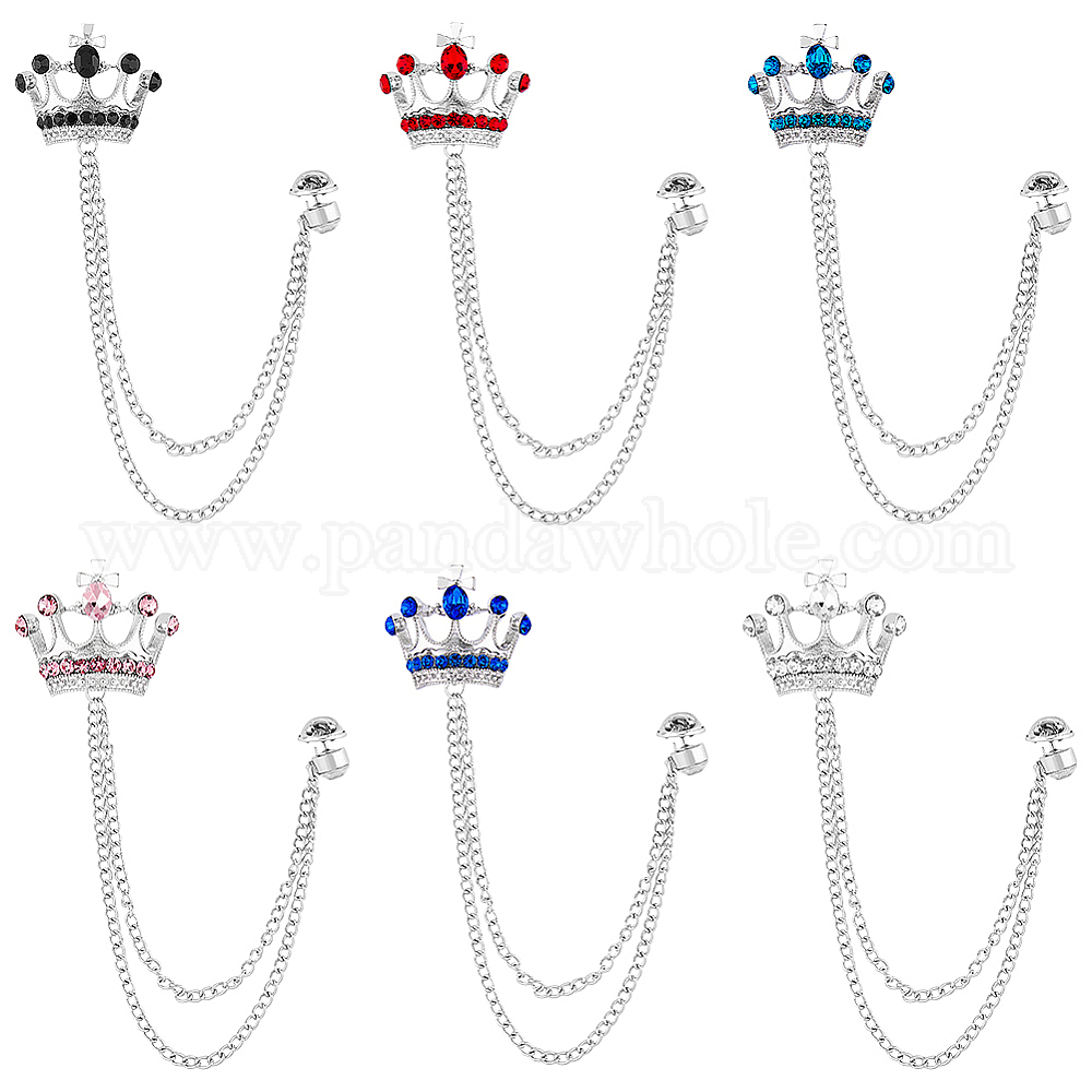 брошь-цепочка с короной из горного хрусталя: длина около 188 мм, шириной 3 мм , Корона: 28x34.5x13 мм, плоско-круглые: 8 mm, штифты : 0.9 мм, 6 цветов, 1 шт / цвет, 6 шт;