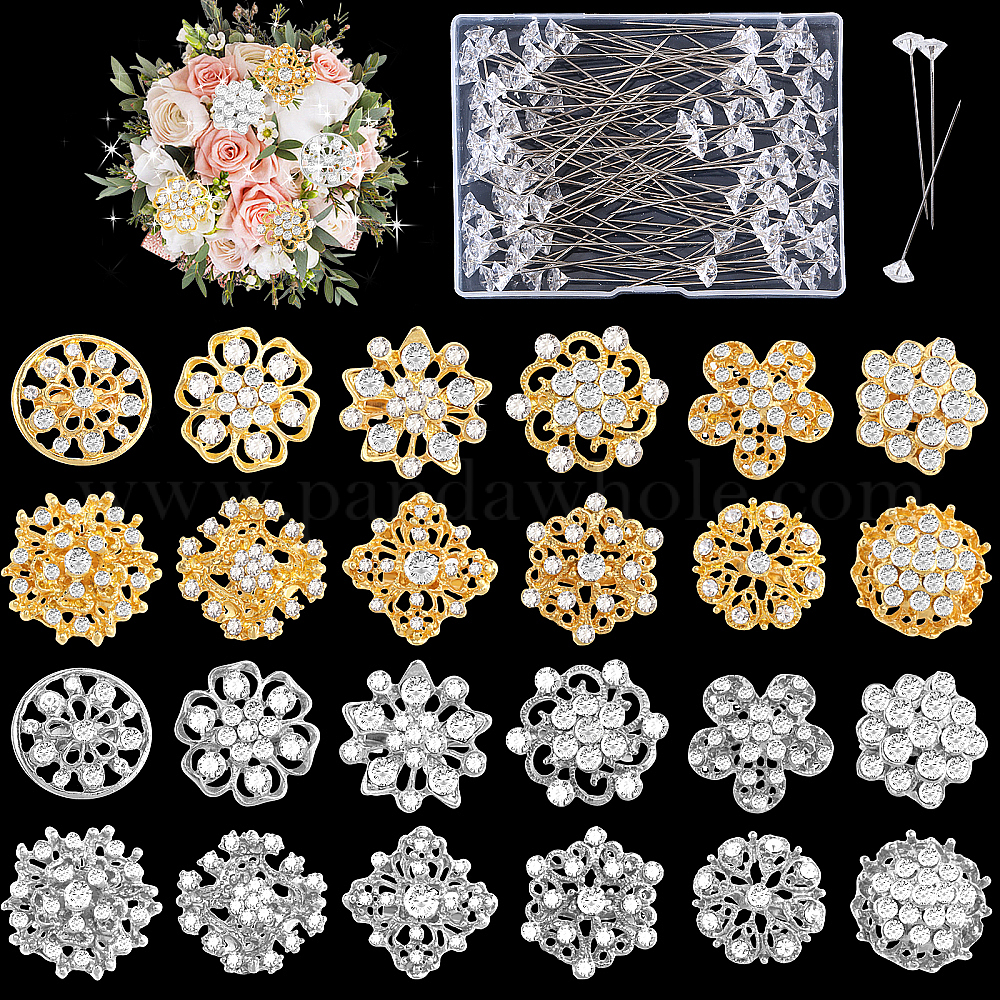 Брошь со стразами в форме цветка: 19~28x19.5~28 мм, 12 стили, 12 шт / комплект, 2 цветов, 1 набор / цвет, 2 наборы;