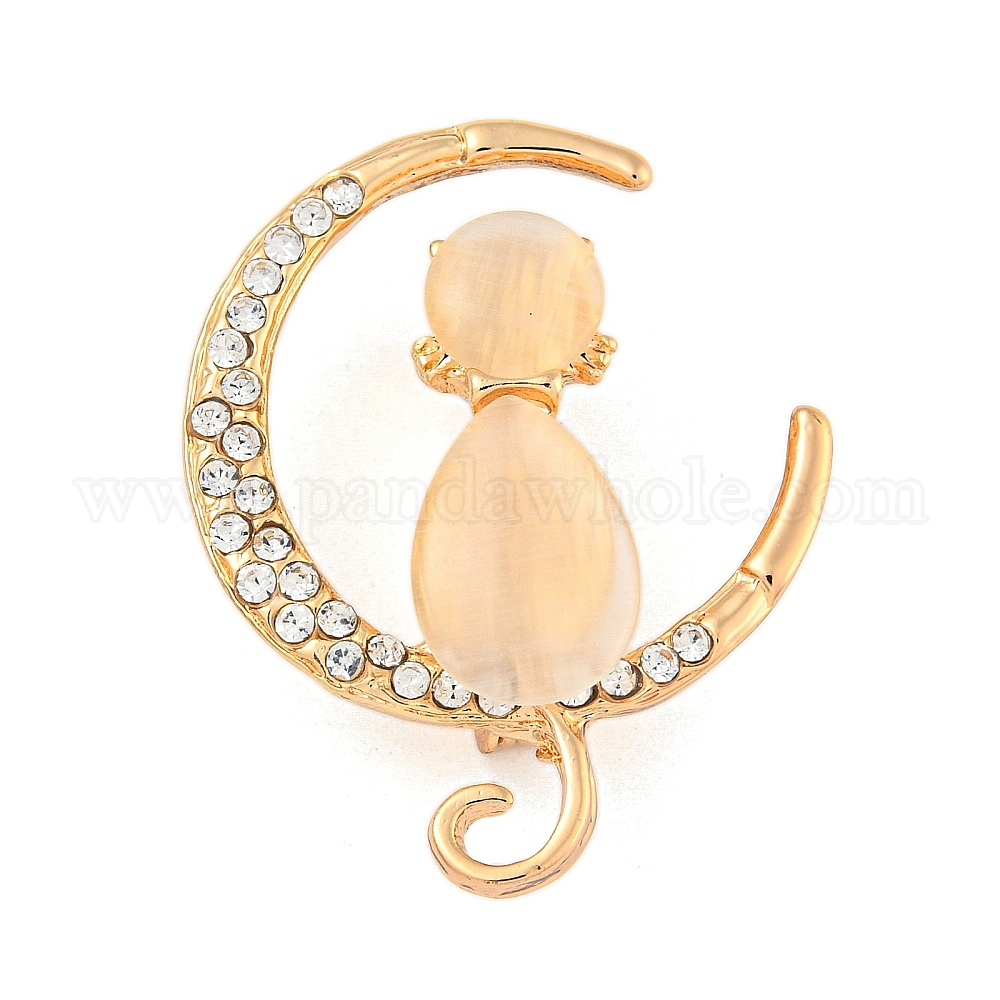 Брошь из сплава "Кошка сидит в полумесяце", с кошачьим глазом и стразы
