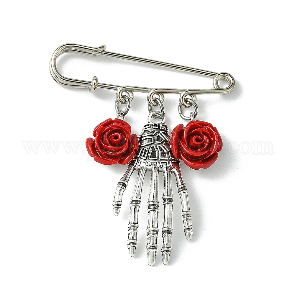 Хэллоуин скелет ручной сплав и синтетический коралловый цветок подвески булавки для юбки, старинное серебро и платина