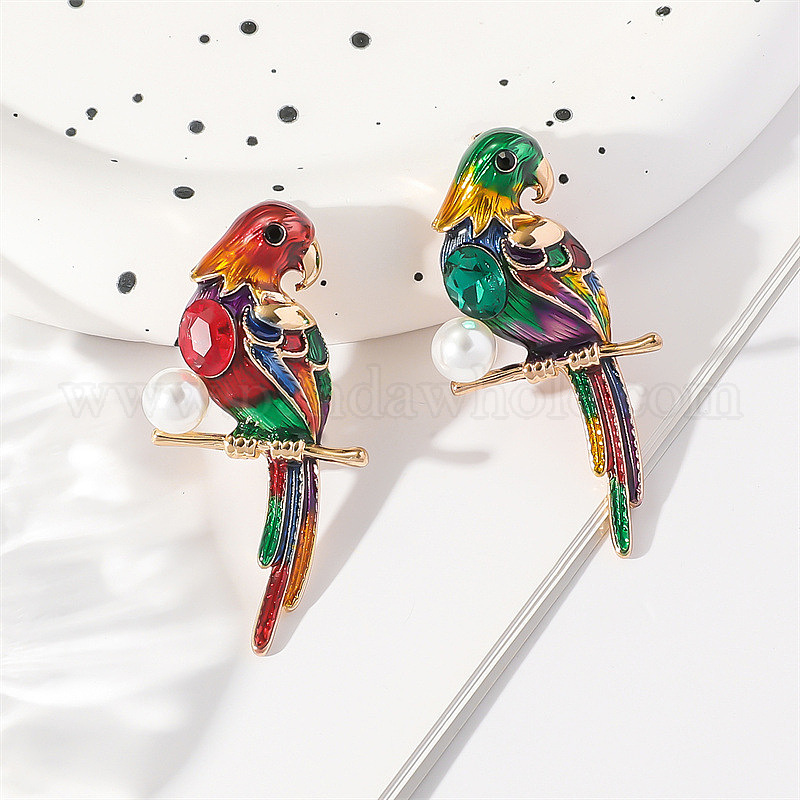 Броши из сплава с эмалью в виде попугая, с стразами и акриловыми шариками