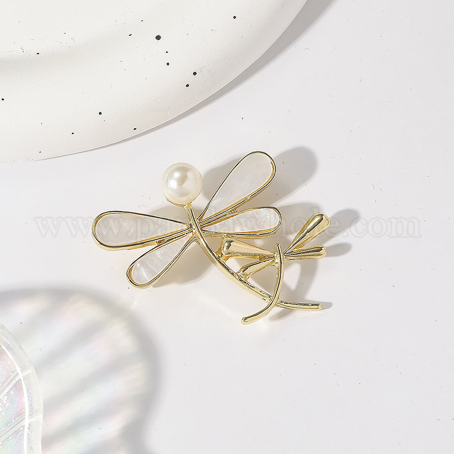 • Белый Броши из сплава стрекоз, с ракушечными бусинами и акриловыми бусинами, белые, 39x43 мм