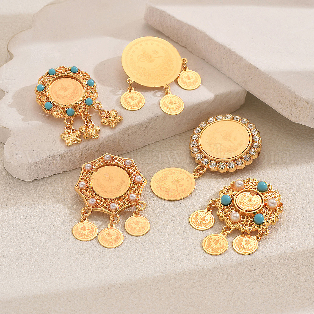 • Золотой Плоские круглые броши из сплава для одежды рюкзака, с пластиковым жемчугом и синтетической бирюзой и плоскими круглыми подвесками, золотые, 26 мм