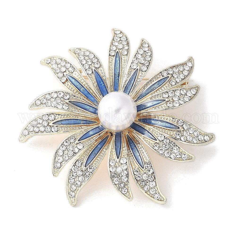 • Light Gold Броши из сплава подсолнечника со стразами для одежды рюкзака, с бусинами из искусственного жемчуга и эмалью, золотой свет, 49x49 мм