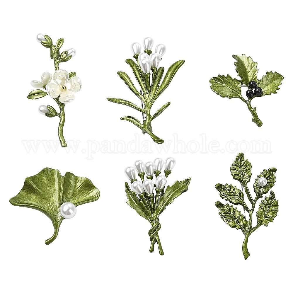 6шт. 6 стили, значки из сплава с покраской, для рюкзака и одежды, листьев и цветов, с пластиковой жемчужины