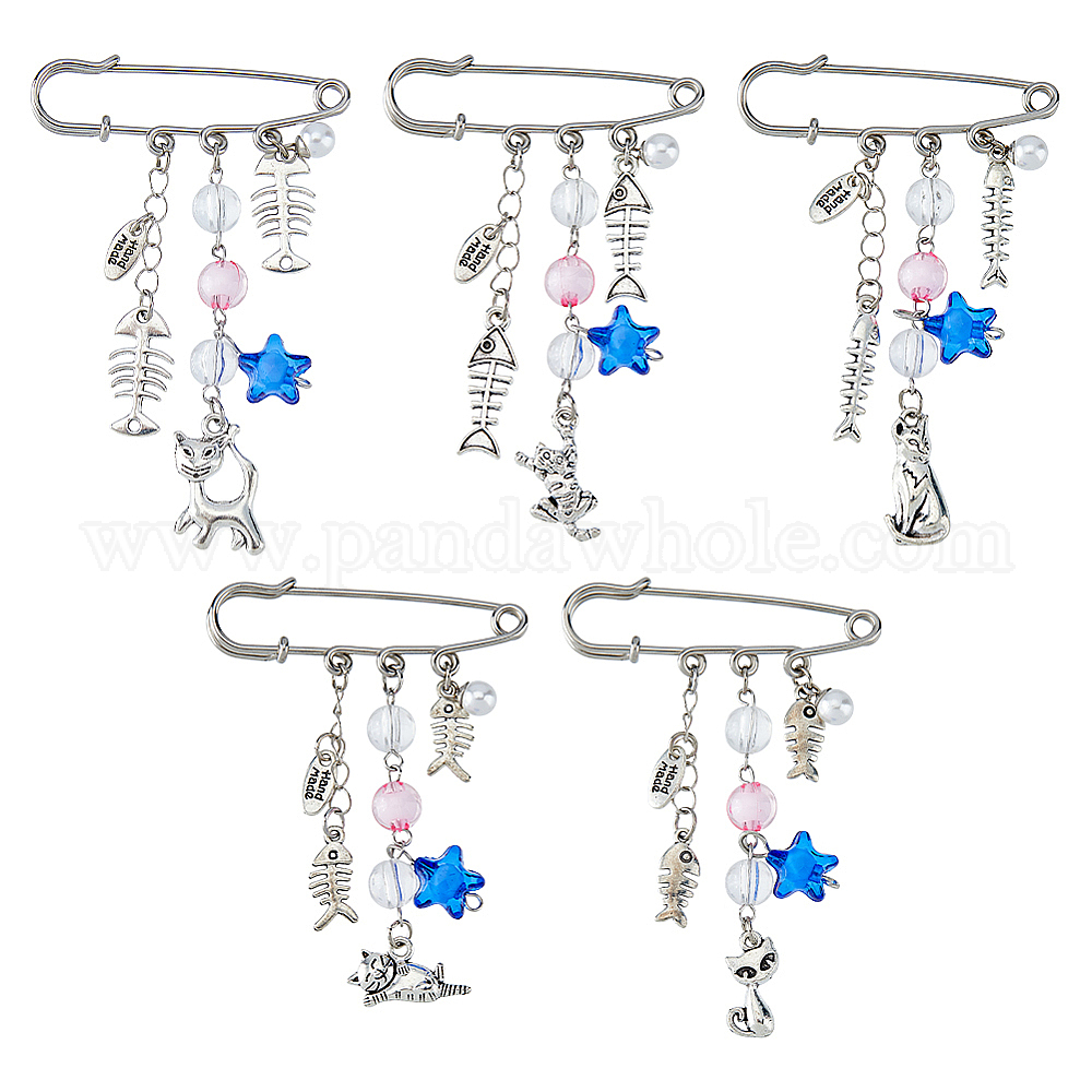 5 шт. 304 булавки из нержавеющей стали, рыбья кость и кошка, с подвесками из сплава и акрила (036HQF)