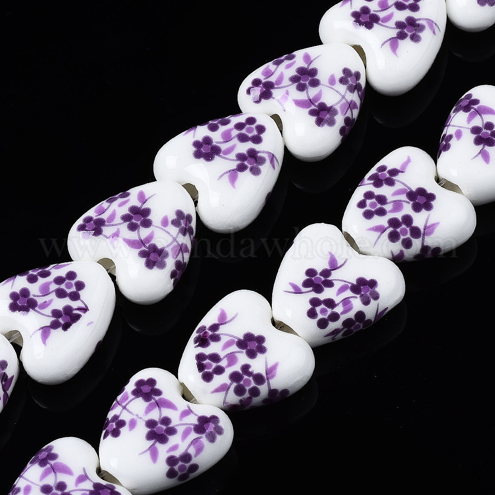 • Фиолетовый Бусины из фарфора и керамики ручной работы, цветок печатных, сердце, фиолетовые, 15x15x7 мм, отверстие : 3 мм, около 23 шт / нитка, 12.8 дюймов (32.5 см)