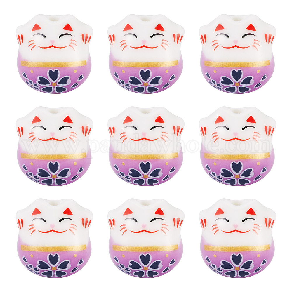 • (52) Непрозрачная лаванда 9шт. фарфоровые бусины ручной работы с принтом, Lucky Cat, разноцветные, 13x14x11 мм, отверстие : 2 мм
