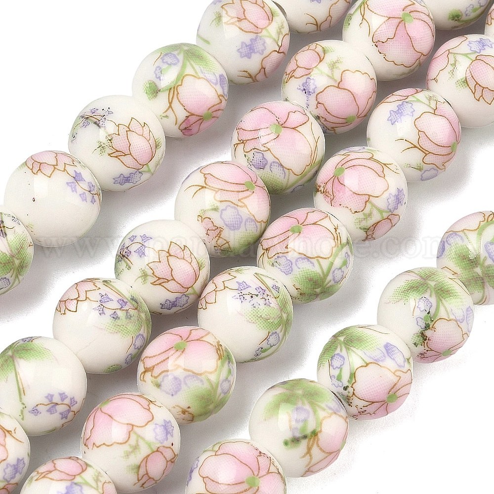 Ручной цветок печатных фарфоровые керамические бусины нити, круглые, 10 мм, отверстие : 2 мм, около 35 шт / нитка, 13.5 дюйм