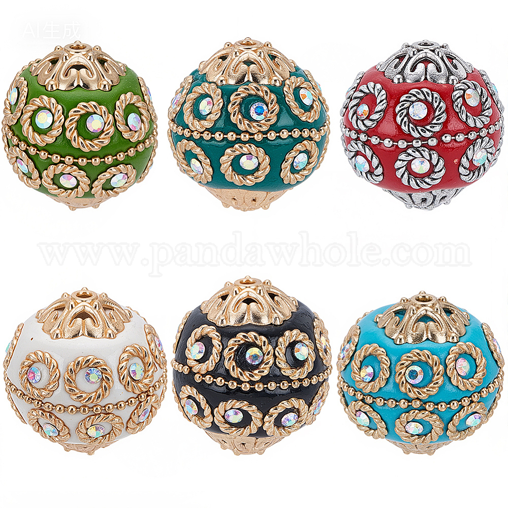 6шт 6 цвета бисера ручной работы из Индонезии, с металлическая фурнитурой, светло-золотистый цвет, круглые