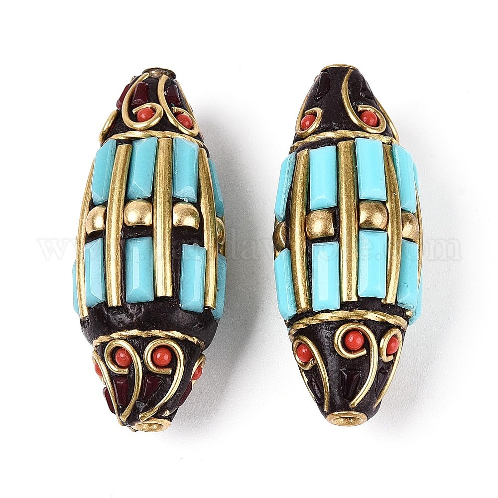 • Бирюза Индонезийские бусины ручной работы, рис, со смолой и непокрытой латунью, бирюзовые, 38.5~39x14~16.5 мм, отверстие : 1.6~1.8 мм