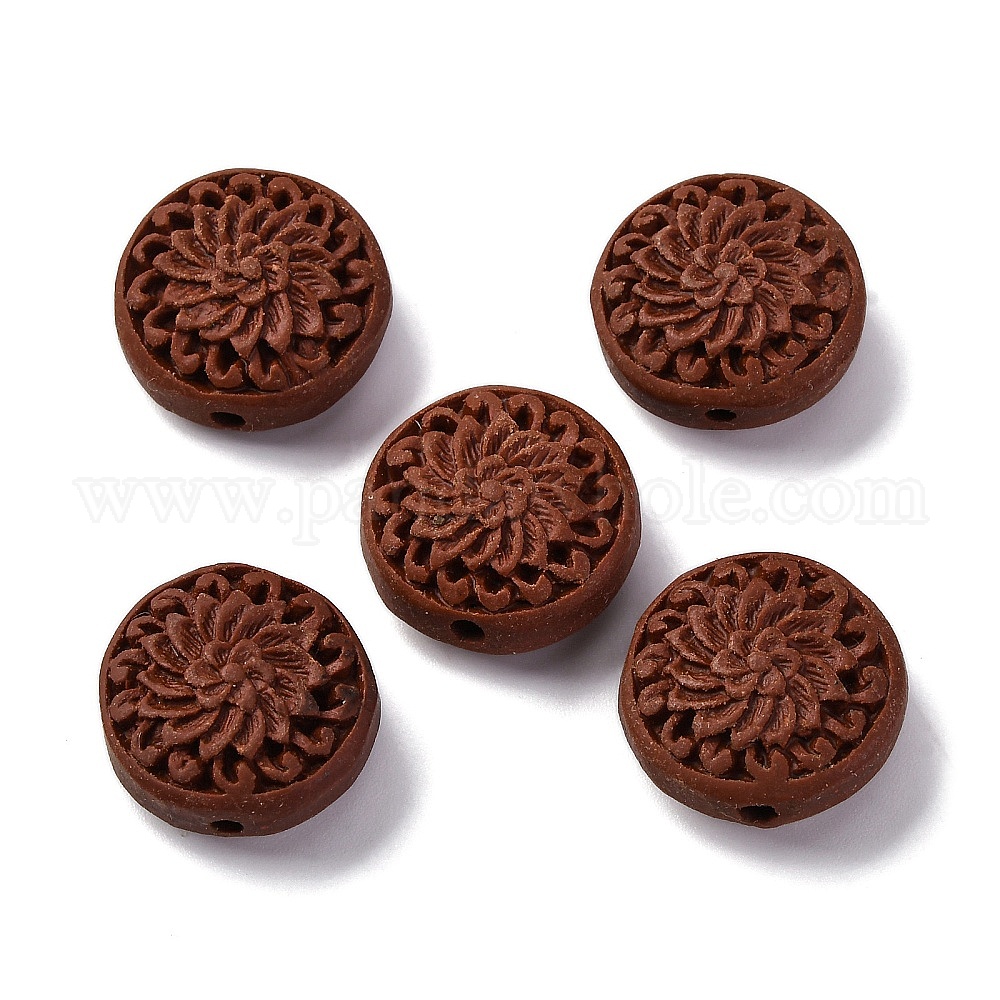 Киноварь бисера, резные лакированные, плоские круглые с цветком