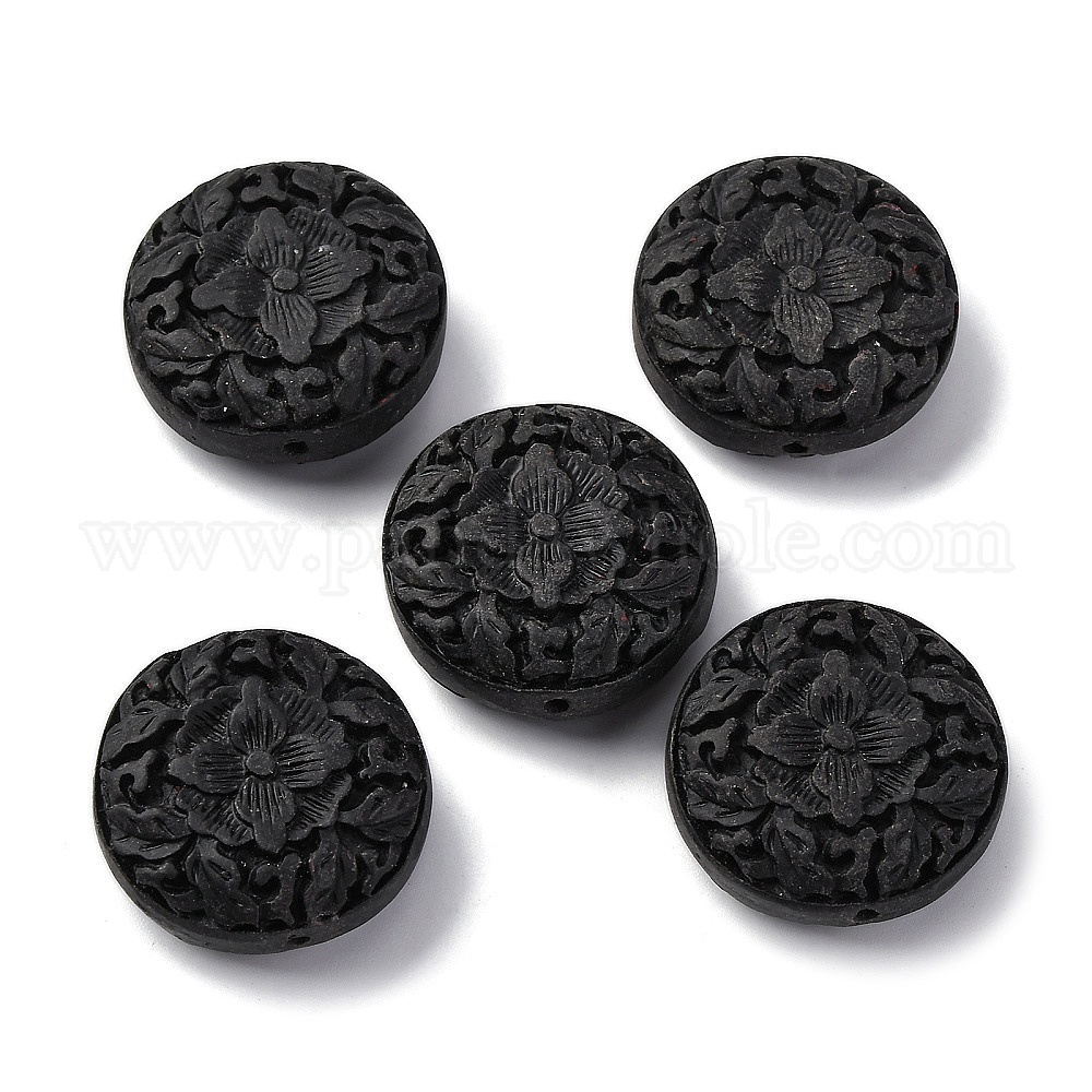 • Черный Киноварь бисера, резные лакированные, плоские круглые с цветком, чёрные, 31.5x13 мм, отверстие : 2 мм