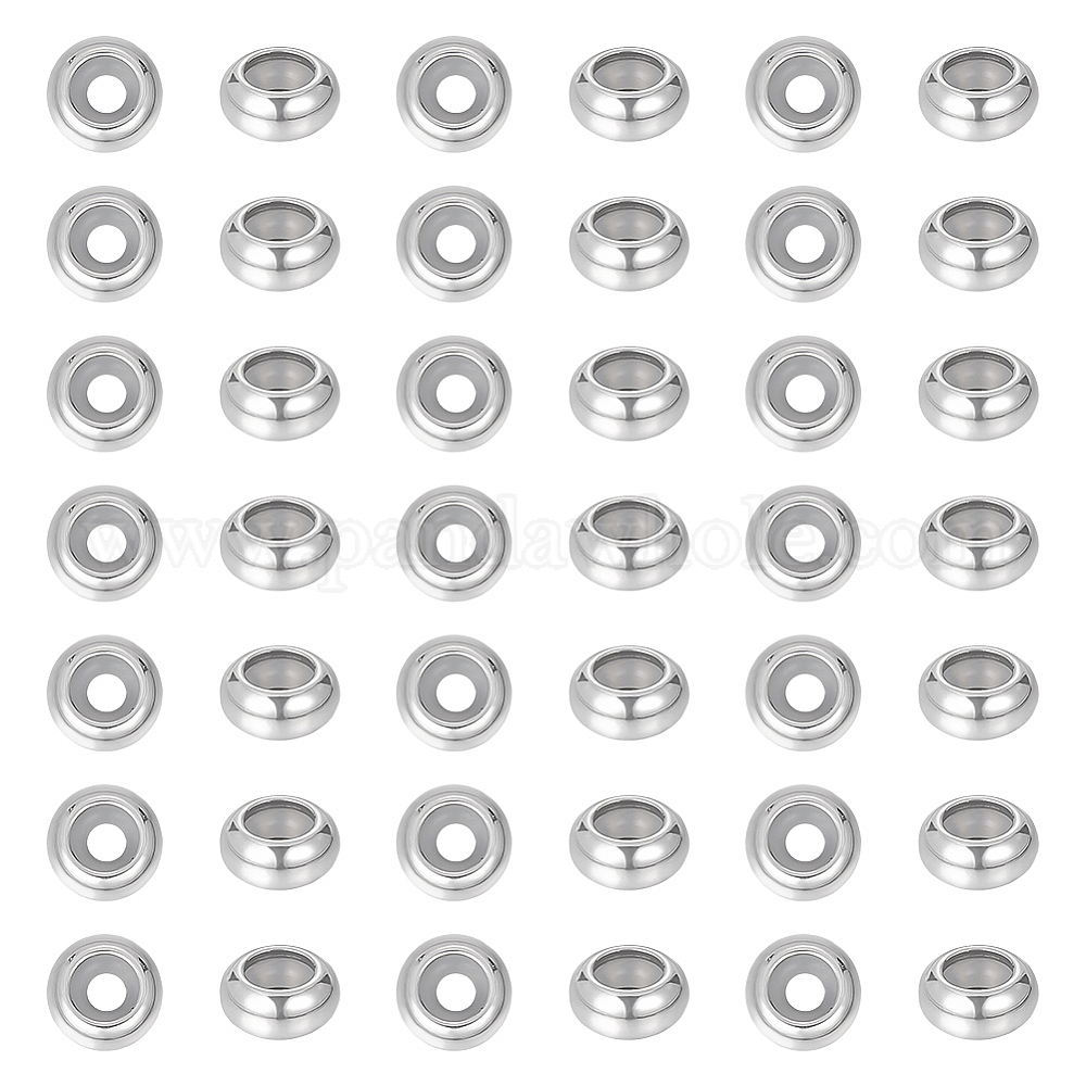 • Нержавеющая Сталь Цвет 201 из нержавеющей стали бусы, с резиной внутри, ползунки, рондель, цвет нержавеющей стали, 10x4.5 мм, отверстие : 3 мм, 50 шт / коробка