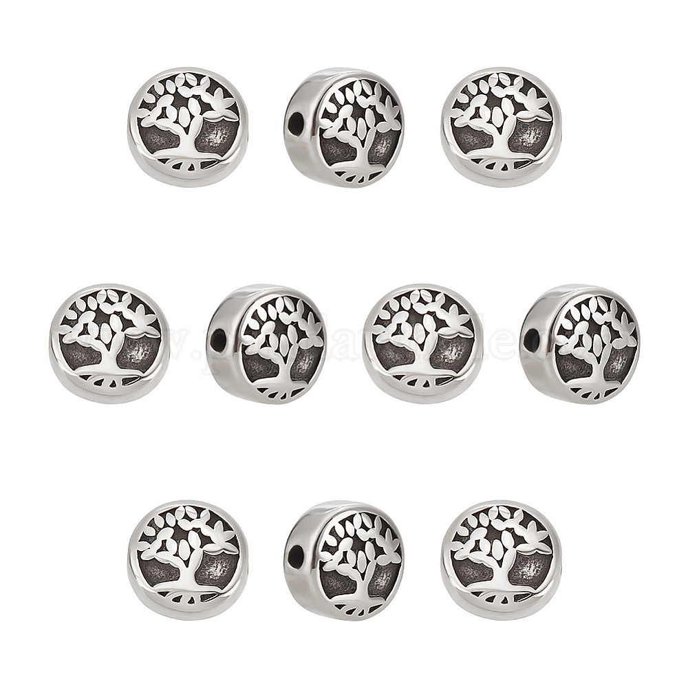 • Античное Серебро 304 из нержавеющей стали бусы, плоские круглые с дерева жизни, античное серебро, 10x5.5 мм, отверстие : 1.8 мм, 10 шт / коробка