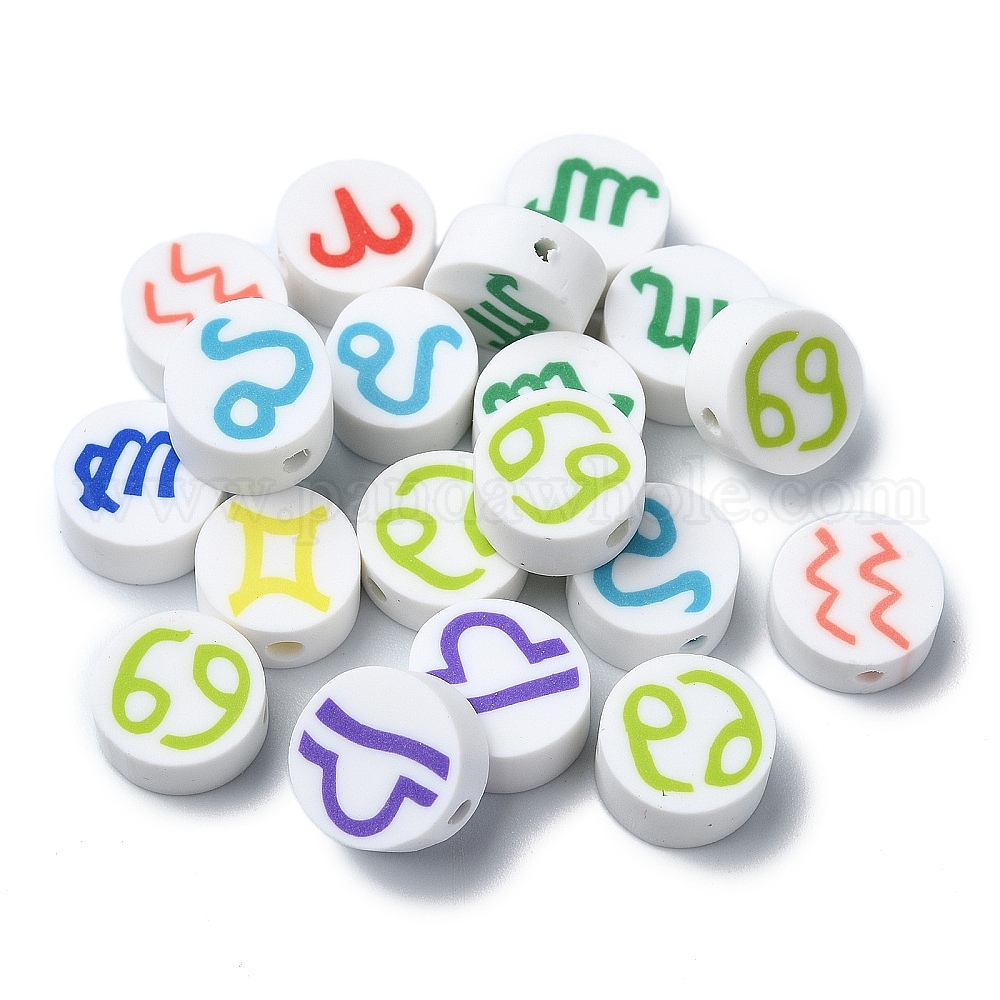 • (52) Непрозрачная лаванда Бусины из полимерной глины , плоские круглые с двенадцати созвездий, разноцветные, 9x4 мм, отверстие : 2 мм