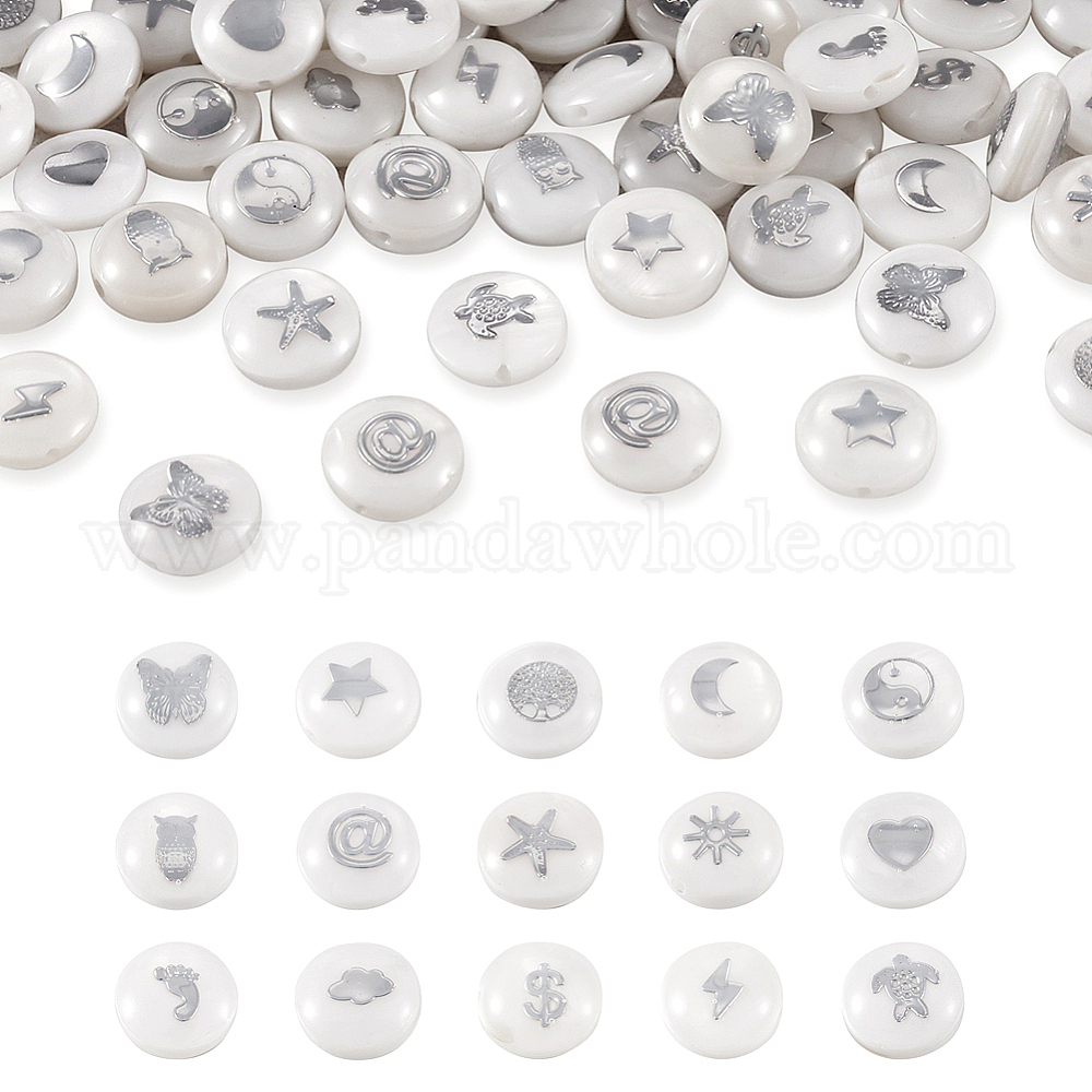 60 шт 15 стили натуральные пресноводные бусины из ракушек, с металлическими украшениями из латуни с платиновым покрытием, плоско-круглые
