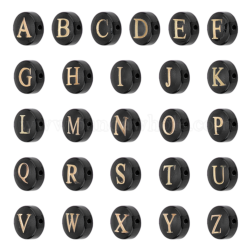 26шт 26 стили натуральные бусины из морских ракушек, горизонтальное отверстие, плоский круглый с золотой буквой, окрашенной распылением, окрашенные, чёрные