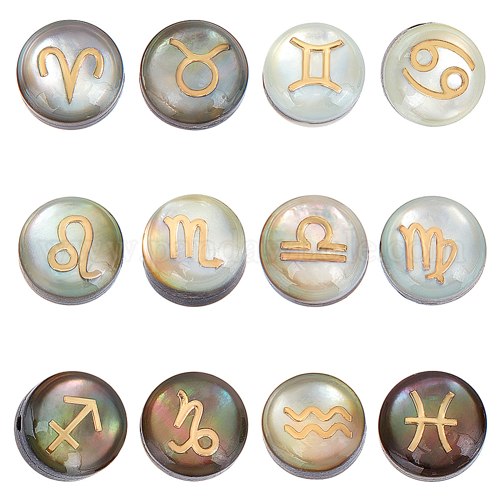 • Mixed Shapes 12 шт. 12 стили натуральные черные бусины-ракушки с золотой эмалью, плоские круглые с созвездием, разнообразные, 8x5.5 мм, отверстие : 1 мм, 1 шт / стиль