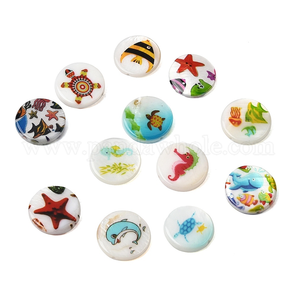 • Jellyfish Плоские круглые бусины из натуральных пресноводных ракушек с принтом в виде морских волн, медуза, 15.5x3~3.5 мм, отверстие : 0.8 мм