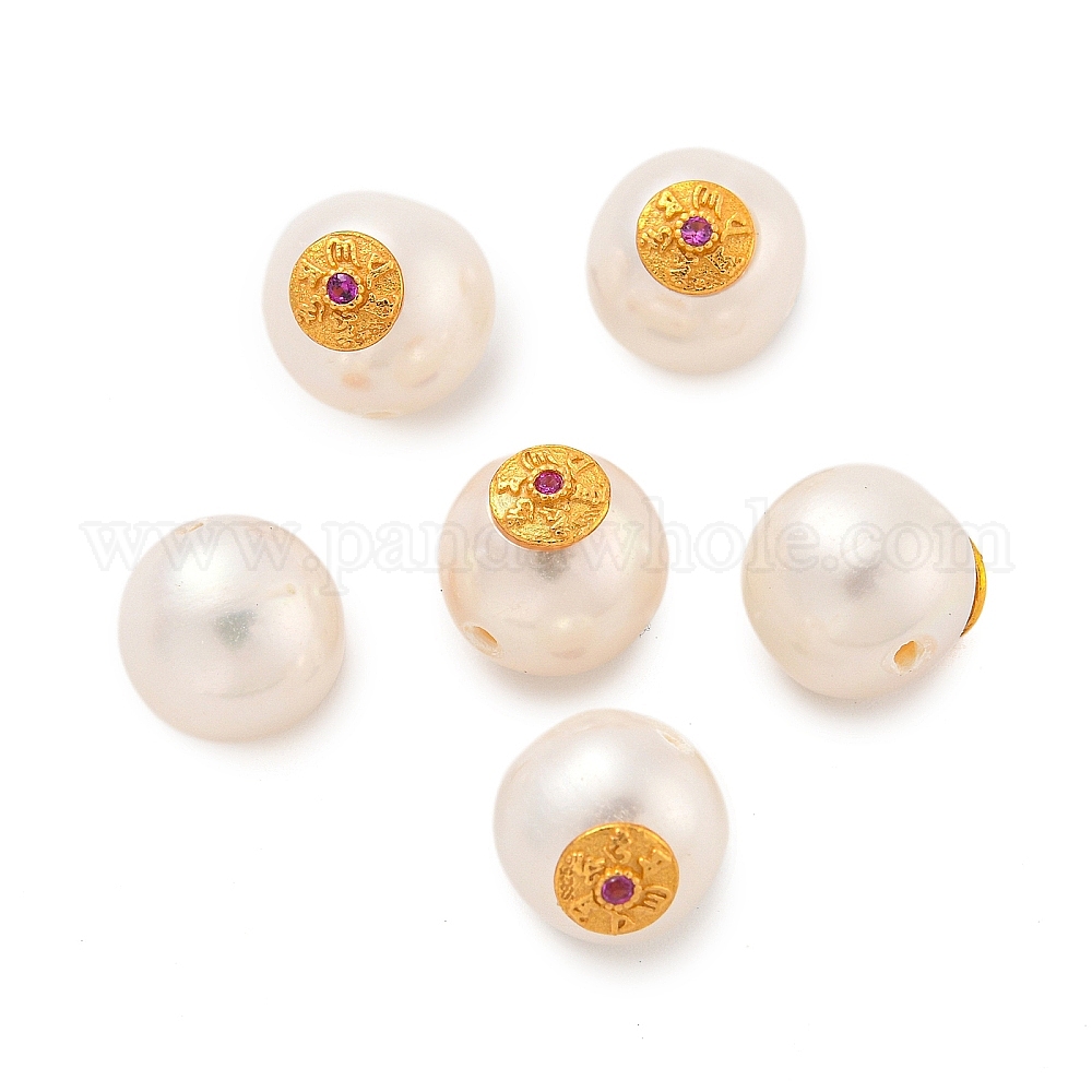 Круглые бусины из натурального пресноводного жемчуга, с долговечной латунной пластиной с покрытием, плоской круглой, с отделкой в виде Ом Мани Падме Хум