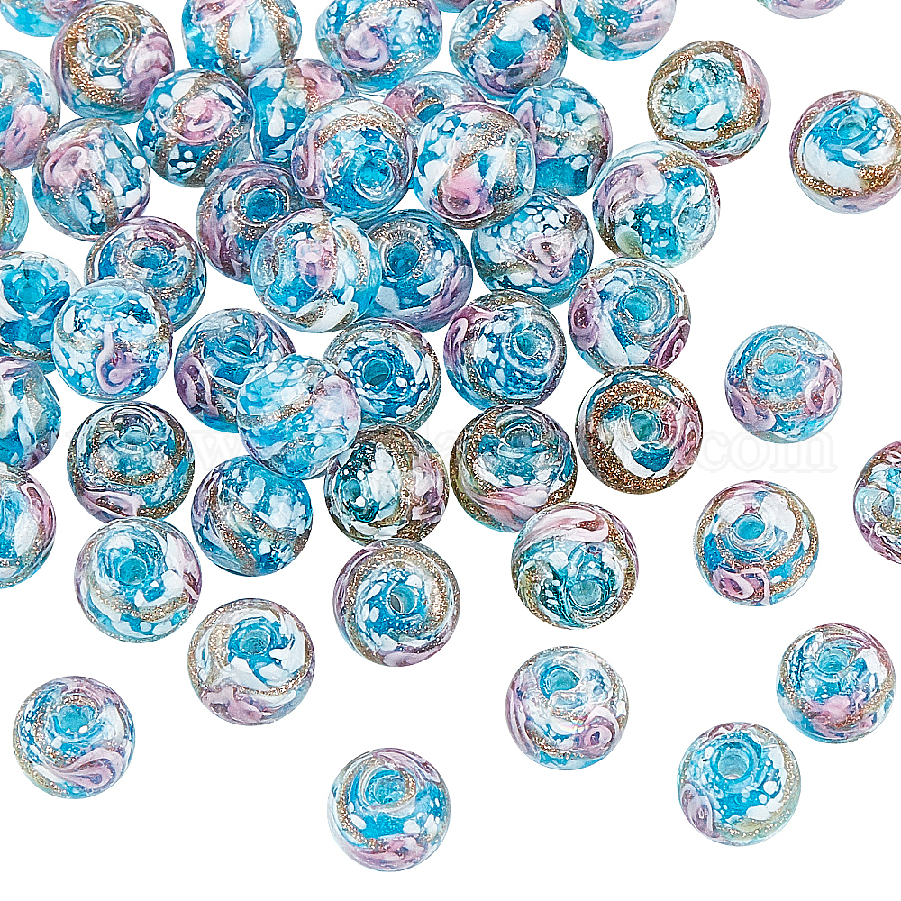 • Темно-Голубой 50шт. бусины ручной работы из золотого песка в технике лэмпворк, со цветком внутри , круглые, глубокое синее небо, 8~8.5x7~8 мм, отверстие : 1.5~2 мм