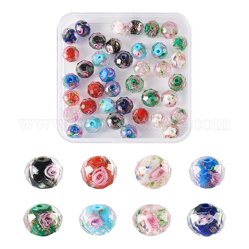 40шт 8 цвета ручной золотой песок бусины лэмпворк нити, со цветком внутри , граненые, шайба