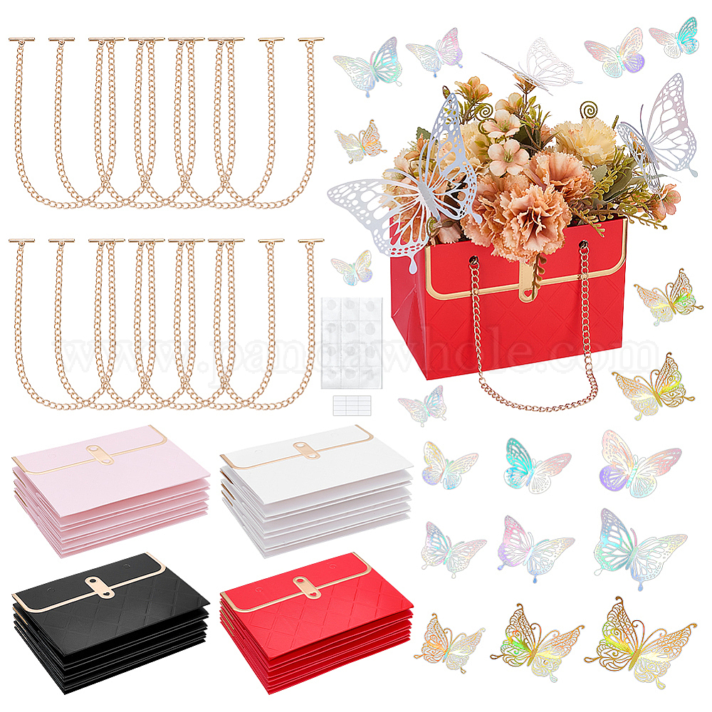 16шт. 4цвета, бумажные пакеты в форме сумочки с цветочным рисунком и цепочками из сплава золотистого цвета, с 36шт. двусторонних клейких наклеек и 3 наборами 3 стилей бумажных наклеек на стену в виде бабочек
