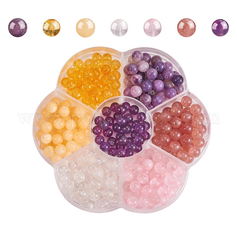 7 стильные бусины из драгоценных камней, синтетический цитрин, натуральный кристалл кварца и клубничный кварц и розовый кварц и лепидолит/фиолетовый камень слюды и аметист и топаз нефрит, смешанные окрашенные и неокрашенные, круглые