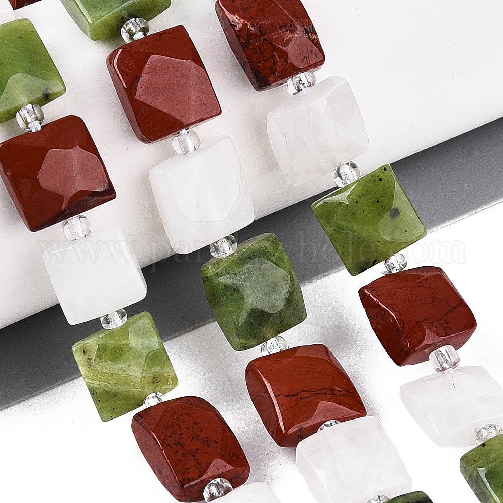 Нити бусин из натурального канадского нефрита, красной яшмы и радужного лунного камня, квадратный, граненые
